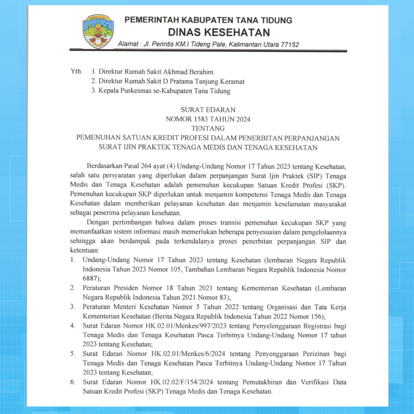 SURAT EDARAN Nomor 1583 Tahun 2024 tentang Pemenuhan Satuan Kredit Profesi Dalam Penerbitan Perpanjangan Surat Ijin Praktek Tenaga Medis dan Tenaga Kesehatan.