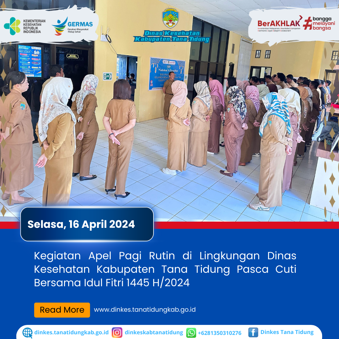 Dinas Kesehatan Kabupaten Tana Tidung Melaksanakan Kegiatan Apel Pagi Rutin Pasca Cuti Bersama Idul Fitri 1445 H. Apel pagi yang dipimpin langsung oleh Sekertaris Dinas Kesehatan Bapak dr..