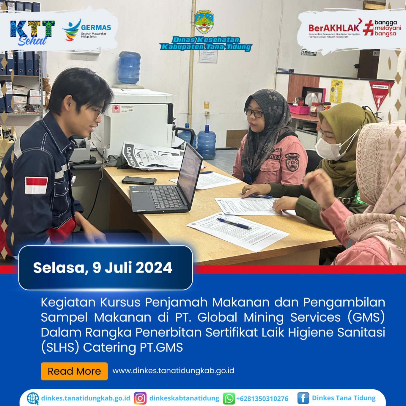 Dinas Kesehatan Kabupaten Tana Tidung melaksanakan kegiatan kursus penjamah makanan dan pengambilan sampel makanan di PT. Global Mining Services (GMS) dalam rangka ..