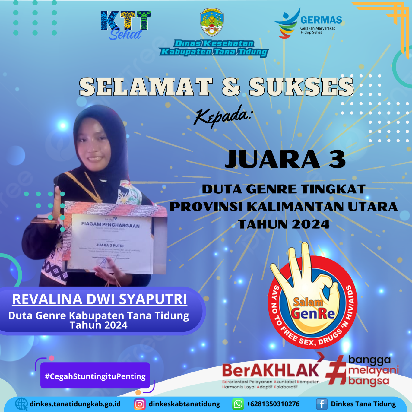 Selamat dan Sukses kepada Revalina Dwi Syaputra atas prestasinya menjadi Juara 3 Duta Genre Tingkat Provinsi Kalimantan Utara Tahun 2024