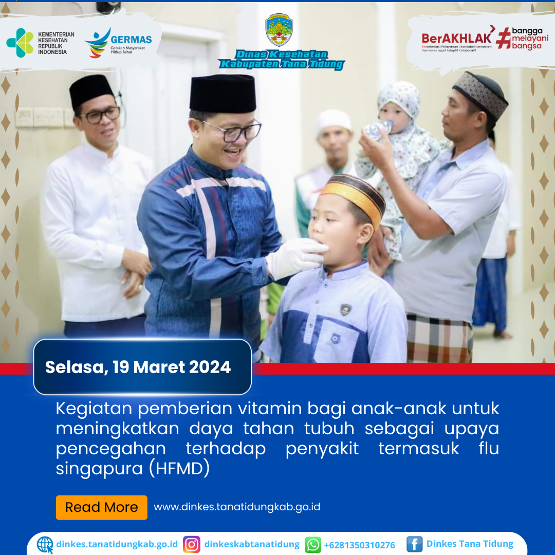 Dalam rangka menjaga daya tahan tubuh sebagai upaya pencegahan terhadap penyakit termasuk flu singapura (HFMD). Pemerintah Kabupaten Tana Tidung melalui Dinas Keseh..