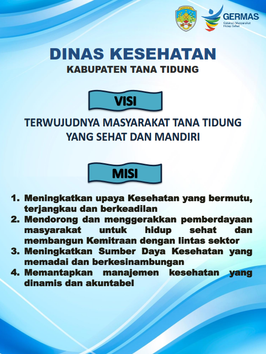 Visi dan Misi Terakhir Update 3 tahun yang lalu 0 View Visi dan Misi Dinas Kesehatan Kabupaten Tana Tidung Business Creative Tips Marketing